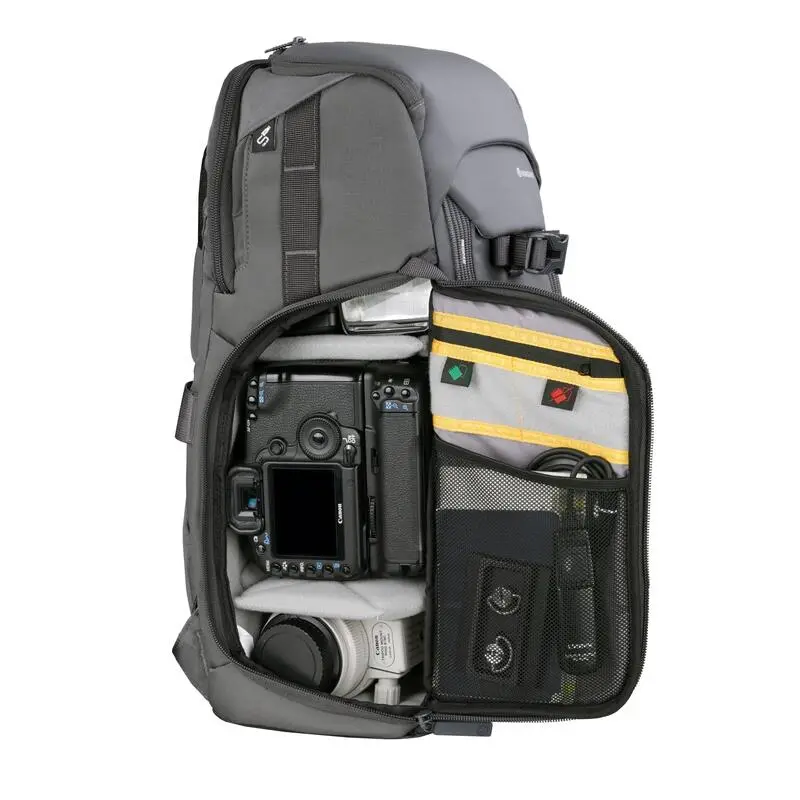 Compra en Decathlon Mochila fotográfica apertura lateral diestros-zurdos Vanguard Veo Adaptor S46 BK Mochila diestros y zurdos Veo Adaptor S46 BK para fotógrafos con acceso lateral ancho para una cámara profesional DSLR con objetivo incorporado, 3-4 objetivos, flash, accesorios y un Macbook de 15″.