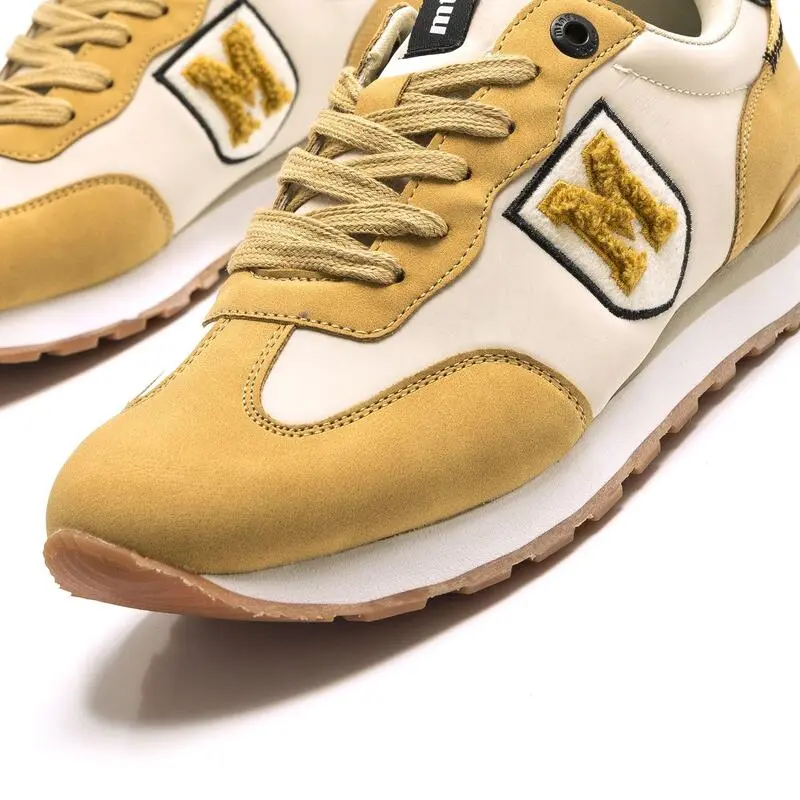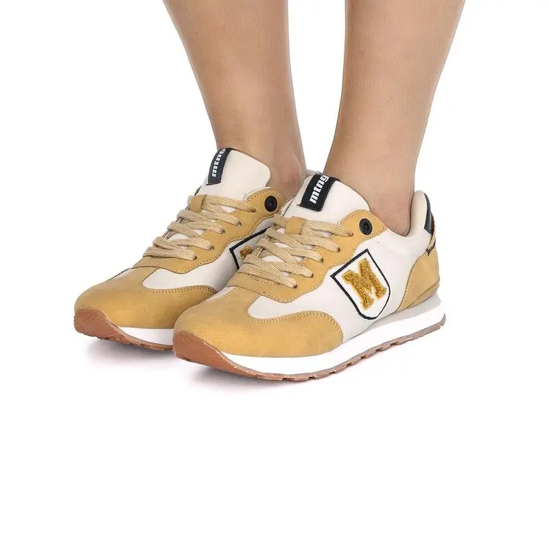 Compra en Decathlon Zapatillas de caminar para mujer mtng joggo en color amarillo Sneaker de chica Joggo Classic mtng de color mostaza combinada con paneles en beige y detalle del logo de la marca en el lateral bordada. Cierre de cordones planos con suela de goma dentada con plant.