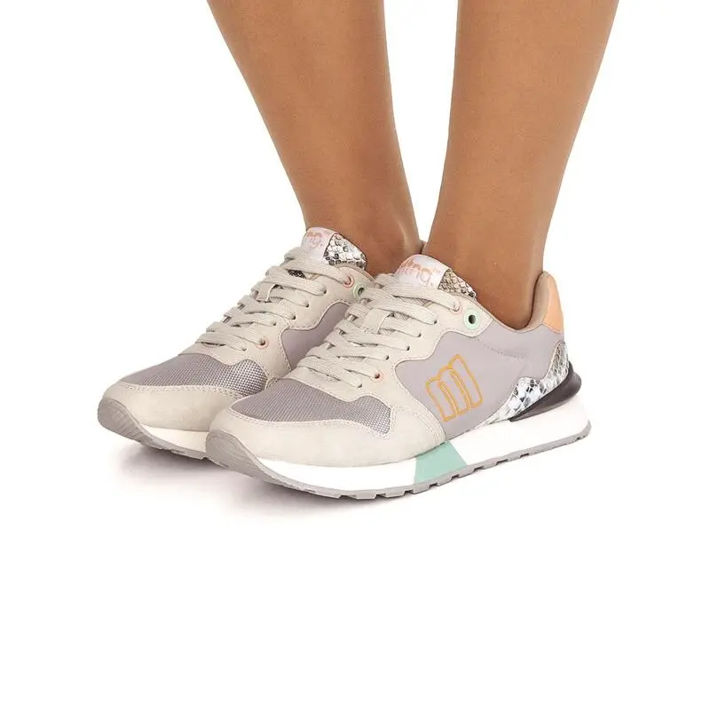 Compra en Decathlon Zapatillas de caminar para mujer mtng joggo en color gris Zapatilla deportiva Joggo Classic mtng para mujer. Fabricada de color gris con detalles en piel de serpiente multicolor y naranja. Logo de la marca en un lateral y nombre en el talón y la lengüeta. S.